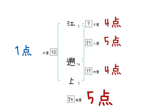 天運![]() | 江遡上さんの天運は7画の4つ星!強い意志や信念を持ち独立心が強い。自立する。 家系が持つ宿命的な運勢を表します。祖先から受け継いだ苗字ですので自分の力が及びません。家柄を象徴します。 |