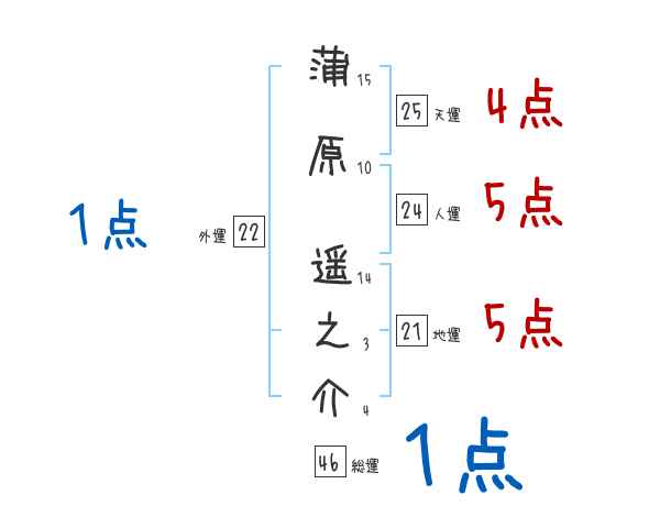 総運![]() | 蒲原遥之介さんの総運は46画の1つ星!迷走することが多く苦労するかも。目先のことにとらわれないように。 あなたの人生を表す1番重要な運勢です。生涯を通じて影響する総合運となり、主に50歳以降の晩年期に影響を及ぼします。 |