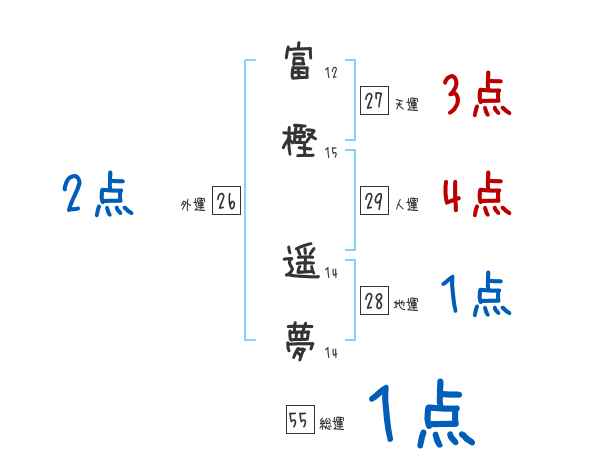 天運![]() | 富樫遥夢さんの天運は27画の3つ星!頭脳明晰だが強情で摩擦が多い傾向。孤立に注意。 家系が持つ宿命的な運勢を表します。祖先から受け継いだ苗字ですので自分の力が及びません。家柄を象徴します。 |