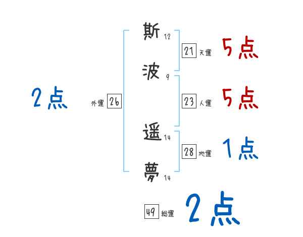 総運![]() | 斯波遥夢さんの総運は49画の2つ星!不安定な性格で明暗がある人生。周りの人には支援されやすい。 あなたの人生を表す1番重要な運勢です。生涯を通じて影響する総合運となり、主に50歳以降の晩年期に影響を及ぼします。 |