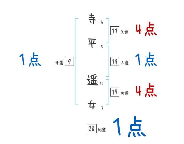 天運![]() | 寺平遥女さんの天運は11画の4つ星!着実に富や地位を得る幸運な人生。 家系が持つ宿命的な運勢を表します。祖先から受け継いだ苗字ですので自分の力が及びません。家柄を象徴します。 |