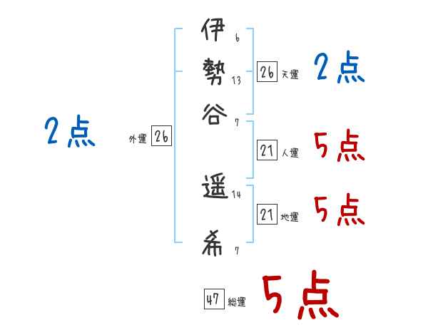 天運![]() | 伊勢谷遥希さんの天運は26画の2つ星!波瀾万丈かも。信頼できる人を大事にしましょう。 家系が持つ宿命的な運勢を表します。祖先から受け継いだ苗字ですので自分の力が及びません。家柄を象徴します。 |