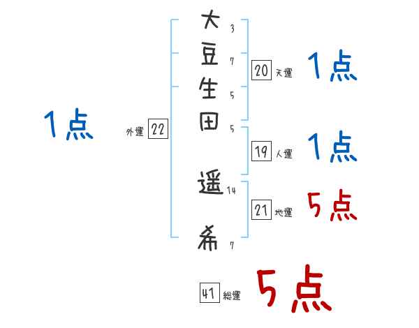 総運![]() | 大豆生田遥希さんの総運は41画の5つ星!大志を抱き、目標に向かって実力を発揮し達成する。温和な性格。 あなたの人生を表す1番重要な運勢です。生涯を通じて影響する総合運となり、主に50歳以降の晩年期に影響を及ぼします。 |