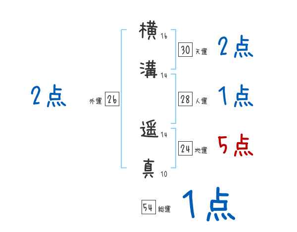 天運![]() | 横溝遥真さんの天運は30画の2つ星!浮き沈みの激しさに注意しましょう。 家系が持つ宿命的な運勢を表します。祖先から受け継いだ苗字ですので自分の力が及びません。家柄を象徴します。 |