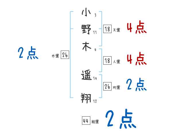 天運![]() | 小野木遥翔さんの天運は18画の4つ星!情熱的で剛気。忍耐力があり信頼される。 家系が持つ宿命的な運勢を表します。祖先から受け継いだ苗字ですので自分の力が及びません。家柄を象徴します。 |