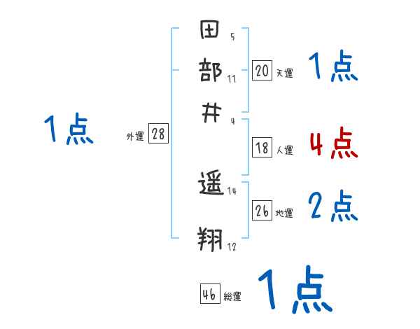 総運![]() | 田部井遥翔さんの総運は46画の1つ星!迷走することが多く苦労するかも。目先のことにとらわれないように。 あなたの人生を表す1番重要な運勢です。生涯を通じて影響する総合運となり、主に50歳以降の晩年期に影響を及ぼします。 |