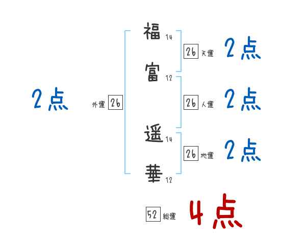 天運![]() | 福富遥華さんの天運は26画の2つ星!波瀾万丈かも。信頼できる人を大事にしましょう。 家系が持つ宿命的な運勢を表します。祖先から受け継いだ苗字ですので自分の力が及びません。家柄を象徴します。 |