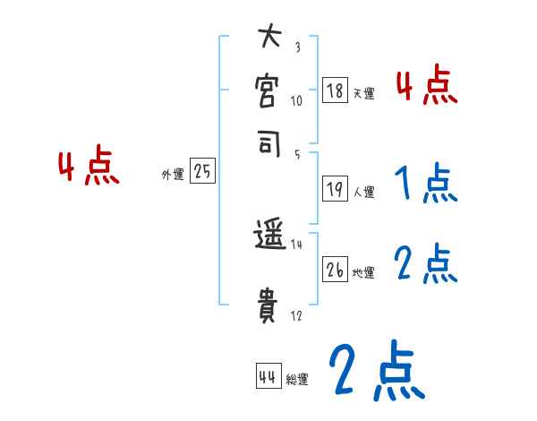 天運![]() | 大宮司遥貴さんの天運は18画の4つ星!情熱的で剛気。忍耐力があり信頼される。 家系が持つ宿命的な運勢を表します。祖先から受け継いだ苗字ですので自分の力が及びません。家柄を象徴します。 |