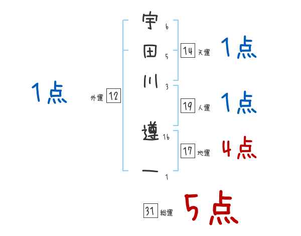 人運![]() | 宇田川遵一さんの人運は19画の1つ星!優れた才能を持ちますが、協調性が足りないことも。周りの人と協力する事を意識しましょう。 性格や才能などを表す2番目に重要な運勢です。人間関係や協調性、社会的な成功に影響します。主に20歳から50歳ぐらいまでの中年期の運勢を表します。 |