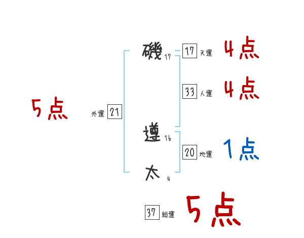 外運![]() | 磯遵太さんの外運は21画の5つ星!統率力がある。独立し成功する。名誉を手に入れる。 生活面を象徴する運勢です。外部から受ける影響力を表し、結婚運、家庭運や職場、環境への順応性を表します。 |
