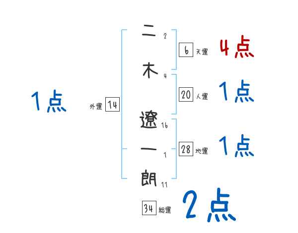 外運![]() | 二木遼一朗さんの外運は14画の1つ星!人に対して優しいがストレスを溜め込みがち。人間関係のトラブルを避けるよう気をつけましょう。 生活面を象徴する運勢です。外部から受ける影響力を表し、結婚運、家庭運や職場、環境への順応性を表します。 |