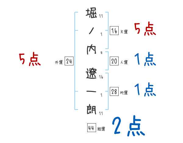 外運![]() | 堀ノ内遼一朗さんの外運は24画の5つ星!家庭運が良く順調な人生。金運にも恵まれる。 生活面を象徴する運勢です。外部から受ける影響力を表し、結婚運、家庭運や職場、環境への順応性を表します。 |