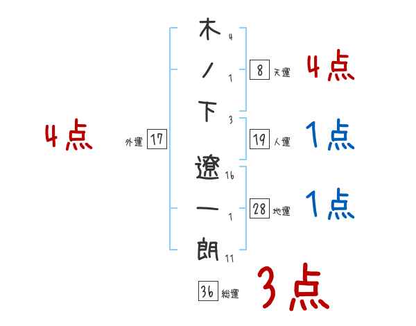 外運![]() | 木ノ下遼一朗さんの外運は17画の4つ星!積極的な行動力。地位を気づき財産を手に入れる。純粋な心と直感力。 生活面を象徴する運勢です。外部から受ける影響力を表し、結婚運、家庭運や職場、環境への順応性を表します。 |
