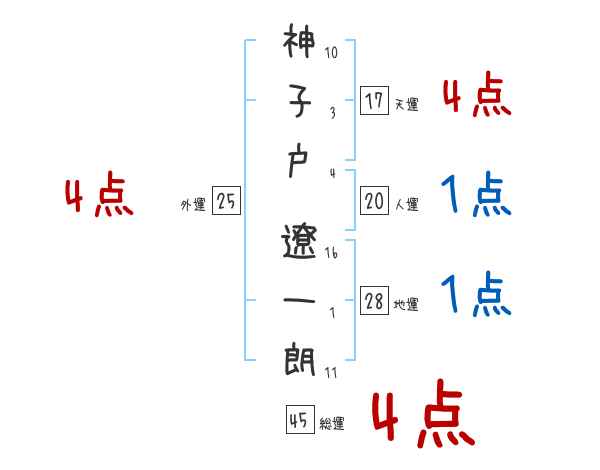 総運![]() | 神子戸遼一朗さんの総運は45画の4つ星!もくもくと物事を進め達成する。地味な努力家。 あなたの人生を表す1番重要な運勢です。生涯を通じて影響する総合運となり、主に50歳以降の晩年期に影響を及ぼします。 |