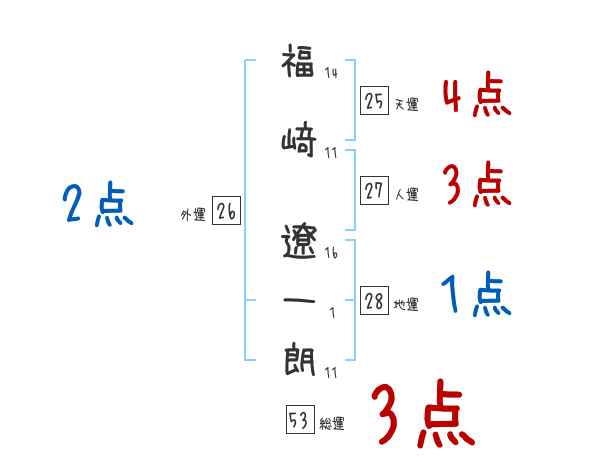 外運![]() | 福﨑遼一朗さんの外運は26画の2つ星!波瀾万丈かも。信頼できる人を大事にしましょう。 生活面を象徴する運勢です。外部から受ける影響力を表し、結婚運、家庭運や職場、環境への順応性を表します。 |
