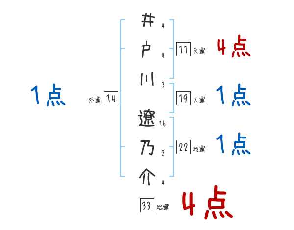 天運![]() | 井戸川遼乃介さんの天運は11画の4つ星!着実に富や地位を得る幸運な人生。 家系が持つ宿命的な運勢を表します。祖先から受け継いだ苗字ですので自分の力が及びません。家柄を象徴します。 |