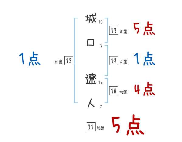 天運![]() | 城口遼人さんの天運は13画の5つ星!才能に恵まれ人気がある。名声を手に入れる。円満な人生。 家系が持つ宿命的な運勢を表します。祖先から受け継いだ苗字ですので自分の力が及びません。家柄を象徴します。 |
