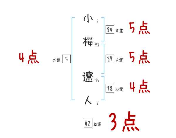 天運![]() | 小桜遼人さんの天運は24画の5つ星!家庭運が良く順調な人生。金運にも恵まれる。 家系が持つ宿命的な運勢を表します。祖先から受け継いだ苗字ですので自分の力が及びません。家柄を象徴します。 |