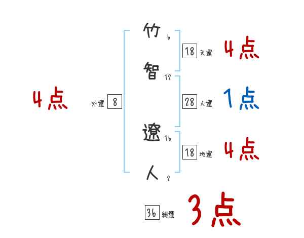 天運![]() | 竹智遼人さんの天運は18画の4つ星!情熱的で剛気。忍耐力があり信頼される。 家系が持つ宿命的な運勢を表します。祖先から受け継いだ苗字ですので自分の力が及びません。家柄を象徴します。 |