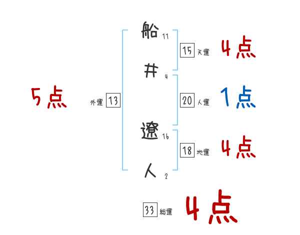 外運![]() | 船井遼人さんの外運は13画の5つ星!才能に恵まれ人気がある。名声を手に入れる。円満な人生。 生活面を象徴する運勢です。外部から受ける影響力を表し、結婚運、家庭運や職場、環境への順応性を表します。 |