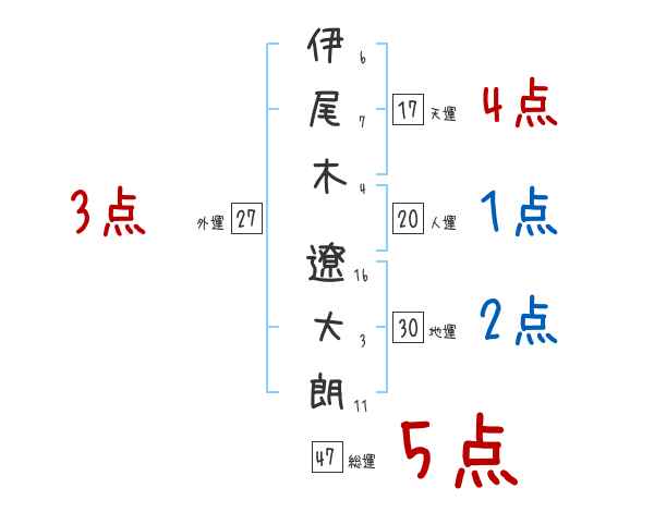 天運![]() | 伊尾木遼大朗さんの天運は17画の4つ星!積極的な行動力。地位を気づき財産を手に入れる。純粋な心と直感力。 家系が持つ宿命的な運勢を表します。祖先から受け継いだ苗字ですので自分の力が及びません。家柄を象徴します。 |