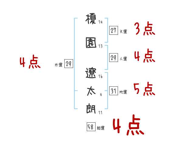 外運![]() | 榎園遼太朗さんの外運は29画の4つ星!完全主義で才能がある。厳格な心の持ち主。 生活面を象徴する運勢です。外部から受ける影響力を表し、結婚運、家庭運や職場、環境への順応性を表します。 |