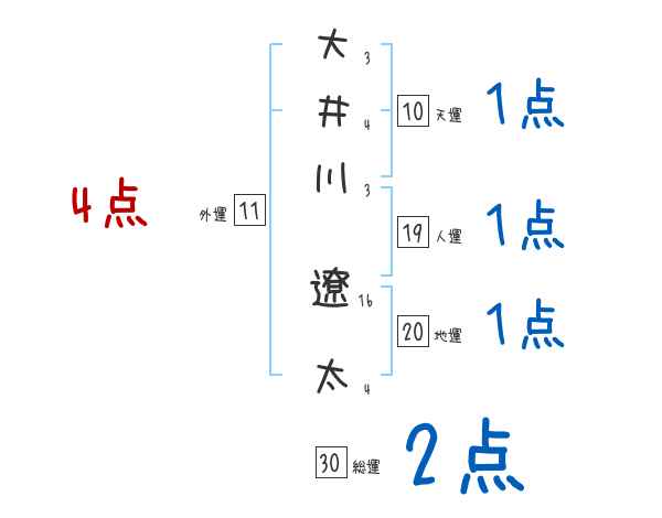 天運![]() | 大井川遼太さんの天運は10画の1つ星!不安を感じやすい傾向。ストレスを抱えないように注意しましょう。 家系が持つ宿命的な運勢を表します。祖先から受け継いだ苗字ですので自分の力が及びません。家柄を象徴します。 |