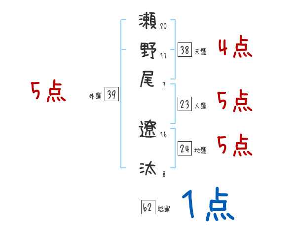 外運![]() | 瀬野尾遼汰さんの外運は39画の5つ星!社交性に優れ人望が厚い。人の上に立ち成功する。 生活面を象徴する運勢です。外部から受ける影響力を表し、結婚運、家庭運や職場、環境への順応性を表します。 |