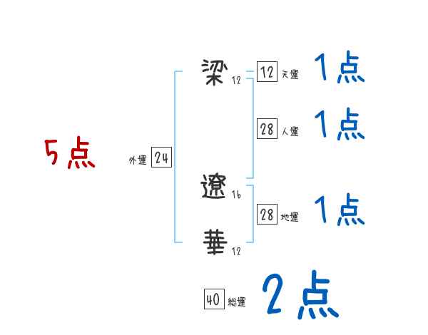 外運![]() | 梁遼華さんの外運は24画の5つ星!家庭運が良く順調な人生。金運にも恵まれる。 生活面を象徴する運勢です。外部から受ける影響力を表し、結婚運、家庭運や職場、環境への順応性を表します。 |