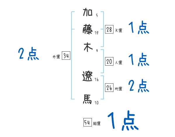 天運![]() | 加藤木遼馬さんの天運は28画の1つ星!家庭環境に注意。スポーツで活躍できる能力があるかも。 家系が持つ宿命的な運勢を表します。祖先から受け継いだ苗字ですので自分の力が及びません。家柄を象徴します。 |