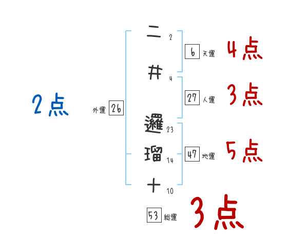 総運![]() | 二井邏瑠十さんの総運は53画の3つ星!やや見栄っ張りで虚栄心がある。散財に注意。 あなたの人生を表す1番重要な運勢です。生涯を通じて影響する総合運となり、主に50歳以降の晩年期に影響を及ぼします。 |