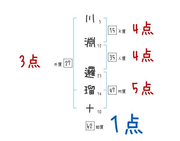 人運![]() | 川淵邏瑠十さんの人運は35画の4つ星!温厚な性格で感受性が高い。穏和な性格で人望が厚い。 性格や才能などを表す2番目に重要な運勢です。人間関係や協調性、社会的な成功に影響します。主に20歳から50歳ぐらいまでの中年期の運勢を表します。 |