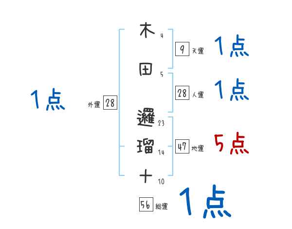 天運![]() | 木田邏瑠十さんの天運は9画の1つ星!消極的で才能を発揮することが苦手なことも。周りの意見に耳を傾けましょう。 家系が持つ宿命的な運勢を表します。祖先から受け継いだ苗字ですので自分の力が及びません。家柄を象徴します。 |