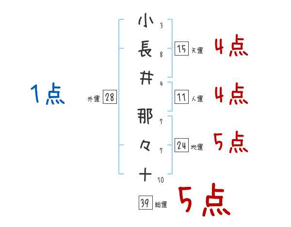 総運![]() | 小長井那々十さんの総運は39画の5つ星!社交性に優れ人望が厚い。人の上に立ち成功する。 あなたの人生を表す1番重要な運勢です。生涯を通じて影響する総合運となり、主に50歳以降の晩年期に影響を及ぼします。 |