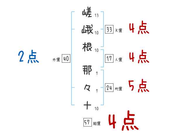 外運![]() | 嵯峨根那々十さんの外運は40画の2つ星!自信過剰で物事に固執するためトラブルに注意。 生活面を象徴する運勢です。外部から受ける影響力を表し、結婚運、家庭運や職場、環境への順応性を表します。 |