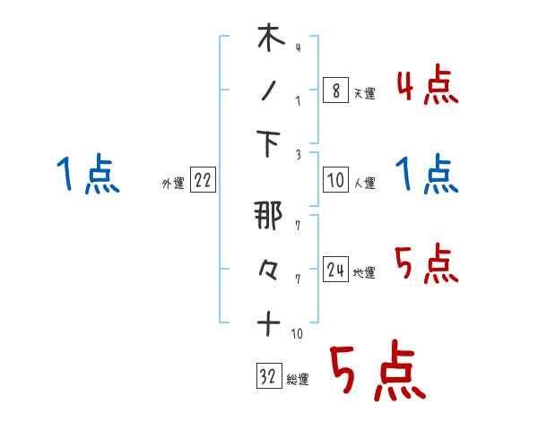 天運![]() | 木ノ下那々十さんの天運は8画の4つ星!勤勉家。根気強く努力し成功する。忍耐力がある。 家系が持つ宿命的な運勢を表します。祖先から受け継いだ苗字ですので自分の力が及びません。家柄を象徴します。 |