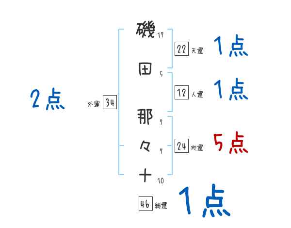 | 外運  | 磯田那々十さんの外運は34画の2つ星!独創性に優れるが、自尊心が強く災難に注意しましょう。生活面を象徴する運勢です。外部から受ける影響力を表し、結婚運、家庭運や職場、環境への順応性を表します。 |