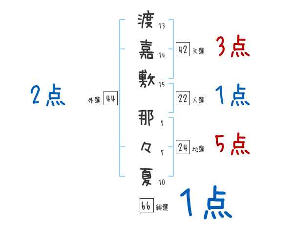 総運![]() | 渡嘉敷那々夏さんの総運は66画の1つ星!迷うことが多く挫折しやすい傾向が。辛抱強く物事に取り組みましょう。 あなたの人生を表す1番重要な運勢です。生涯を通じて影響する総合運となり、主に50歳以降の晩年期に影響を及ぼします。 |