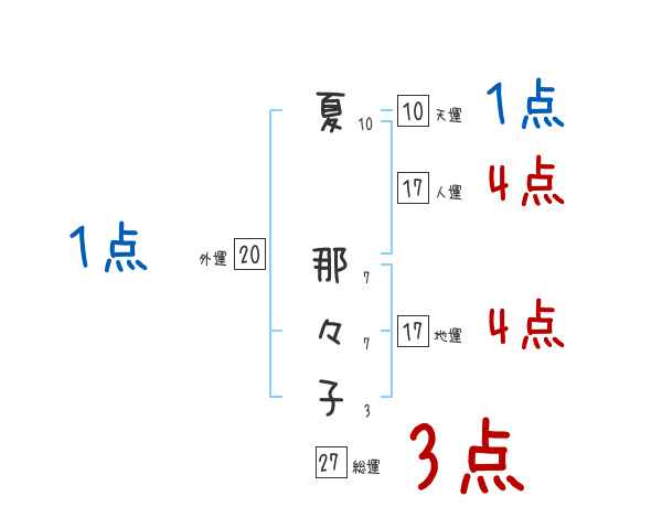 天運![]() | 夏那々子さんの天運は10画の1つ星!不安を感じやすい傾向。ストレスを抱えないように注意しましょう。 家系が持つ宿命的な運勢を表します。祖先から受け継いだ苗字ですので自分の力が及びません。家柄を象徴します。 |