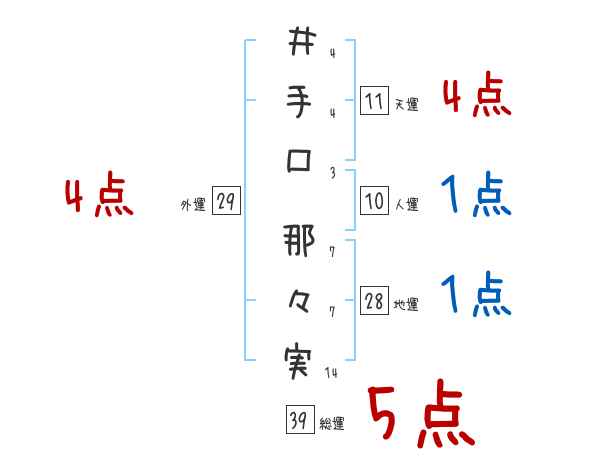 総運![]() | 井手口那々実さんの総運は39画の5つ星!社交性に優れ人望が厚い。人の上に立ち成功する。 あなたの人生を表す1番重要な運勢です。生涯を通じて影響する総合運となり、主に50歳以降の晩年期に影響を及ぼします。 |