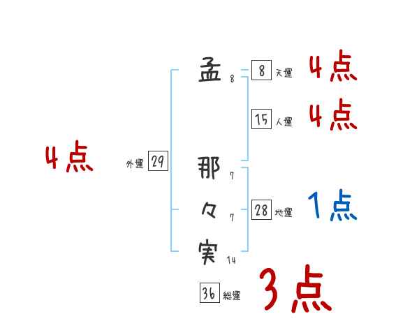 外運![]() | 孟那々実さんの外運は29画の4つ星!完全主義で才能がある。厳格な心の持ち主。 生活面を象徴する運勢です。外部から受ける影響力を表し、結婚運、家庭運や職場、環境への順応性を表します。 |