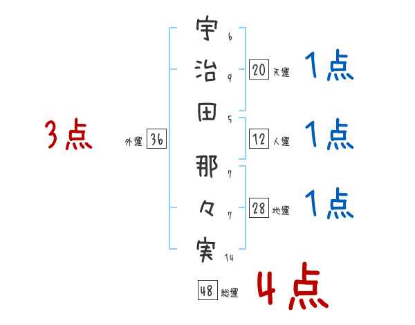 外運![]() | 宇治田那々実さんの外運は36画の3つ星!先見性が豊かです。多少神経質で苦労することも。 生活面を象徴する運勢です。外部から受ける影響力を表し、結婚運、家庭運や職場、環境への順応性を表します。 |