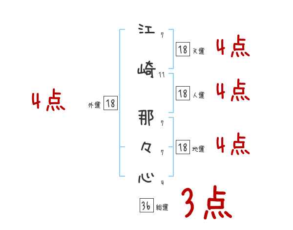 天運![]() | 江崎那々心さんの天運は18画の4つ星!情熱的で剛気。忍耐力があり信頼される。 家系が持つ宿命的な運勢を表します。祖先から受け継いだ苗字ですので自分の力が及びません。家柄を象徴します。 |