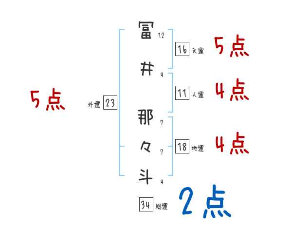 天運![]() | 冨井那々斗さんの天運は16画の5つ星!人望が厚く大きく発展する。逆転成功が見える。 家系が持つ宿命的な運勢を表します。祖先から受け継いだ苗字ですので自分の力が及びません。家柄を象徴します。 |