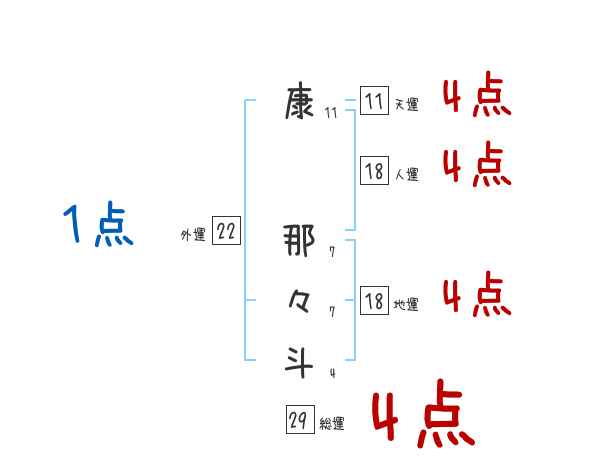 天運![]() | 康那々斗さんの天運は11画の4つ星!着実に富や地位を得る幸運な人生。 家系が持つ宿命的な運勢を表します。祖先から受け継いだ苗字ですので自分の力が及びません。家柄を象徴します。 |