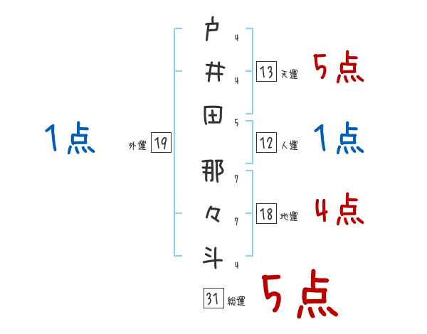 総運![]() | 戸井田那々斗さんの総運は31画の5つ星!社交性があり判断力に優れる。順風満帆な人生で円満な生活。 あなたの人生を表す1番重要な運勢です。生涯を通じて影響する総合運となり、主に50歳以降の晩年期に影響を及ぼします。 |