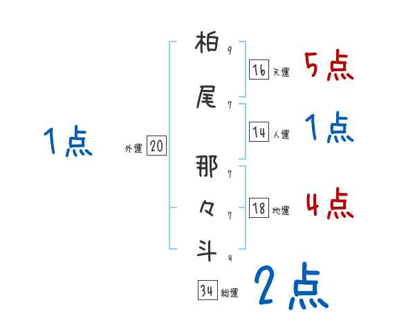 総運![]() | 柏尾那々斗さんの総運は34画の2つ星!独創性に優れるが、自尊心が強く災難に注意しましょう。 あなたの人生を表す1番重要な運勢です。生涯を通じて影響する総合運となり、主に50歳以降の晩年期に影響を及ぼします。 |
