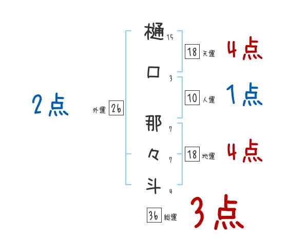天運![]() | 樋口那々斗さんの天運は18画の4つ星!情熱的で剛気。忍耐力があり信頼される。 家系が持つ宿命的な運勢を表します。祖先から受け継いだ苗字ですので自分の力が及びません。家柄を象徴します。 |