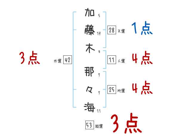 総運![]() | 加藤木那々海さんの総運は53画の3つ星!やや見栄っ張りで虚栄心がある。散財に注意。 あなたの人生を表す1番重要な運勢です。生涯を通じて影響する総合運となり、主に50歳以降の晩年期に影響を及ぼします。 |