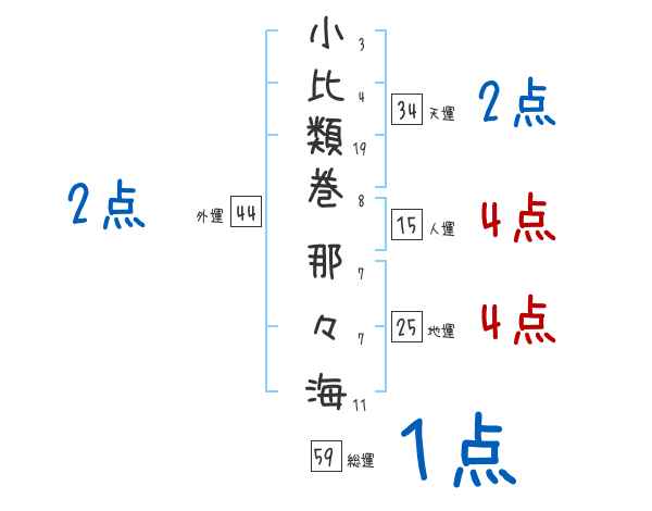 天運![]() | 小比類巻那々海さんの天運は34画の2つ星!独創性に優れるが、自尊心が強く災難に注意しましょう。 家系が持つ宿命的な運勢を表します。祖先から受け継いだ苗字ですので自分の力が及びません。家柄を象徴します。 |